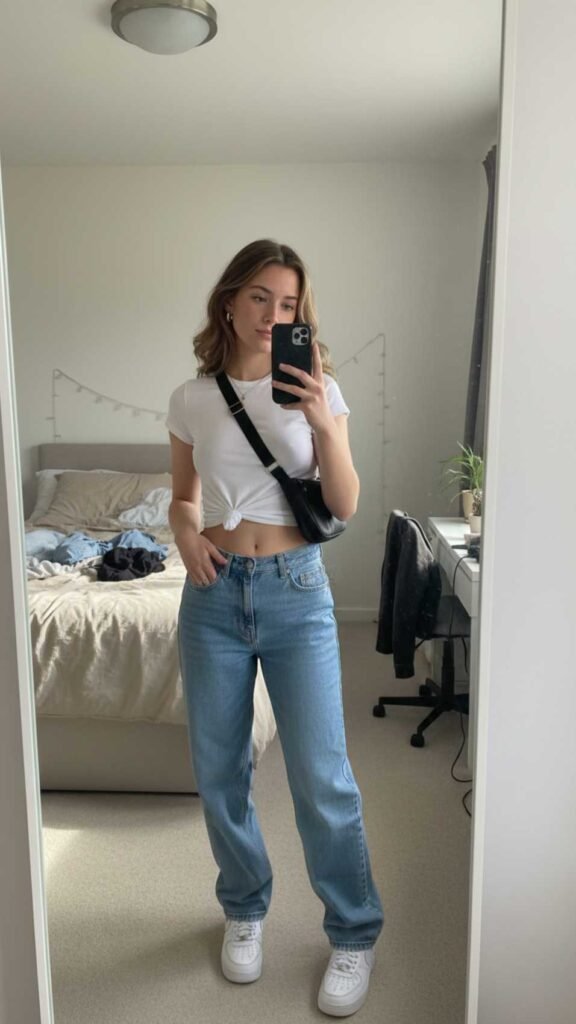 This is the outfit that started the whole baggy jeans obsession for so many people and it still looks just as good now as it did when everyone first started wearing it. A plain white fitted tee – nothing fancy, just clean and simple – tucked or knotted slightly at the front with baggy light wash jeans and white Air Force 1s is such a perfect combination. It’s clean, it’s cool, and it works on everyone. Add some small gold hoops and a crossbody bag and you honestly look like you have the best style without spending any money or putting in any real effort.