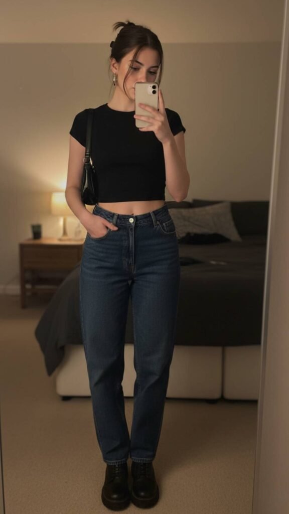 There is something about a black crop top with baggy jeans and chunky boots that just hits differently. It’s that combination of feminine and a little edgy that is so easy to pull off and always looks intentional. The crop top keeps the silhouette balanced so the baggy jeans don’t overwhelm the look, and chunky boots add that little bit of attitude that makes the whole outfit feel complete. Go for black or dark wash baggy jeans to keep everything in the same tonal family, add a small black bag and some silver jewelry, and this outfit is genuinely so good.