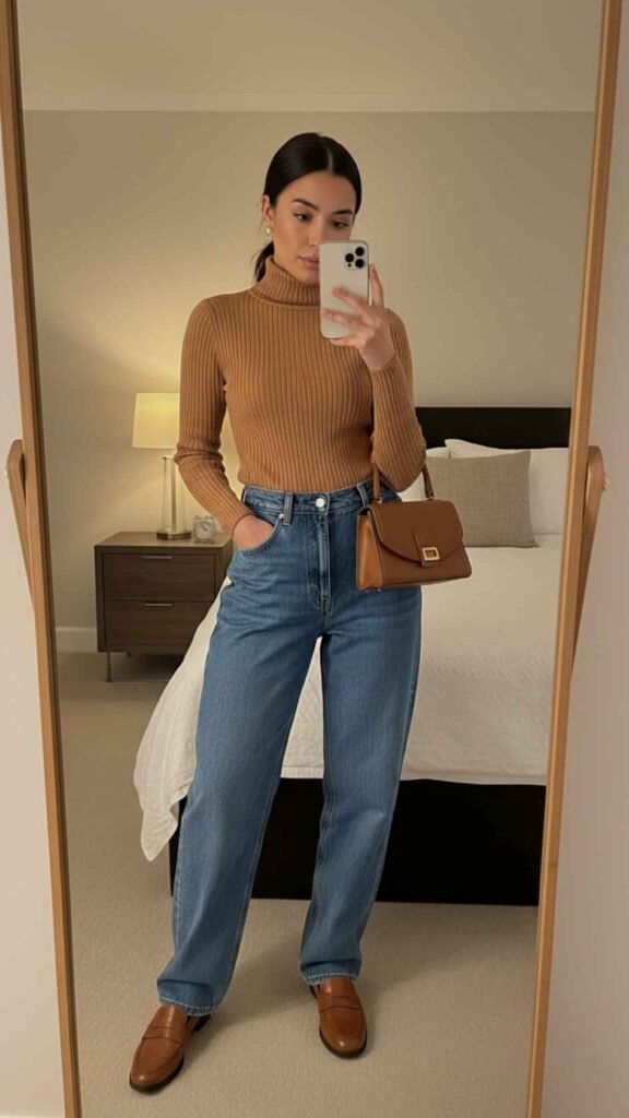 6. Fitted Turtleneck + Baggy Jeans + Loafers