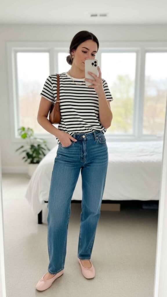 5. Striped Tee + Baggy Jeans + Ballet Flats