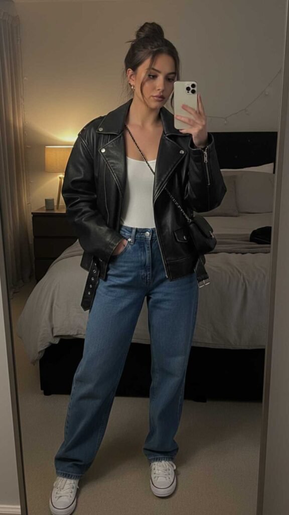 Two relaxed pieces together like a leather jacket and baggy jeans could easily look like too much but this combination actually works so well because the structure of the leather jacket balances the softness of the denim. Wear a simple fitted tee or bodysuit underneath, leave the jacket open, and go with clean white sneakers to keep everything grounded. This is one of those outfits that looks cool in literally every city in every season and never feels overdone. It photographs so well and the leather jacket instantly makes the whole thing look more expensive and put together.