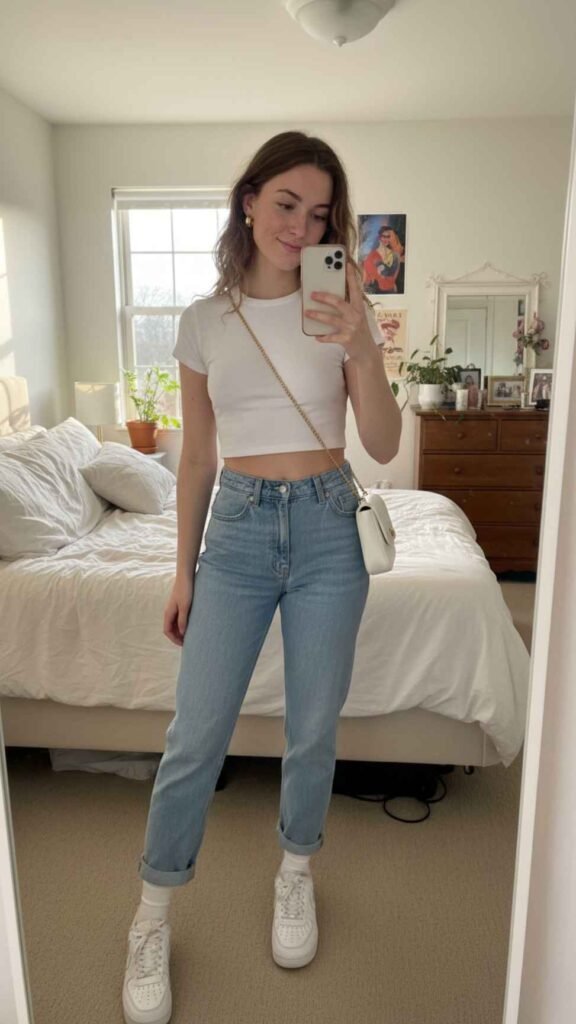 This outfit is the one you reach for when you want to look cute without even trying. A simple white crop tee tucked loosely into high waist straight jeans just works every single time. The proportions are perfect – the crop shows a little waist, the straight leg keeps everything balanced, and white sneakers keep it casual and clean. Add small gold hoops and a mini shoulder bag and honestly you look like you put in way more effort than you did. It’s one of those combinations that just photographs well, feels comfortable all day, and works whether you’re grabbing coffee or walking around the city.