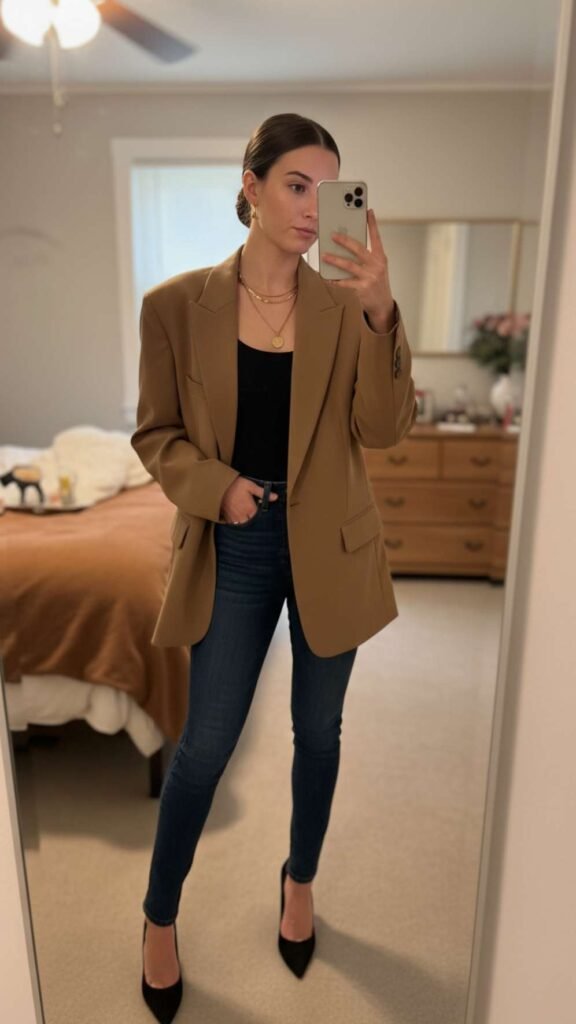 This is the outfit that makes people think you have your life completely together. An oversized blazer – whether it’s camel, grey, or classic black – thrown over a simple bodysuit or fitted tee with skinny jeans and pointed heels is such a good combination. It looks polished and intentional without feeling stiff or overdressed. The blazer does all the heavy lifting and instantly makes the whole look feel elevated. Roll the sleeves up slightly, add a thin belt if you want to define your waist, and you’re honestly ready for anything from a lunch meeting to a night out.