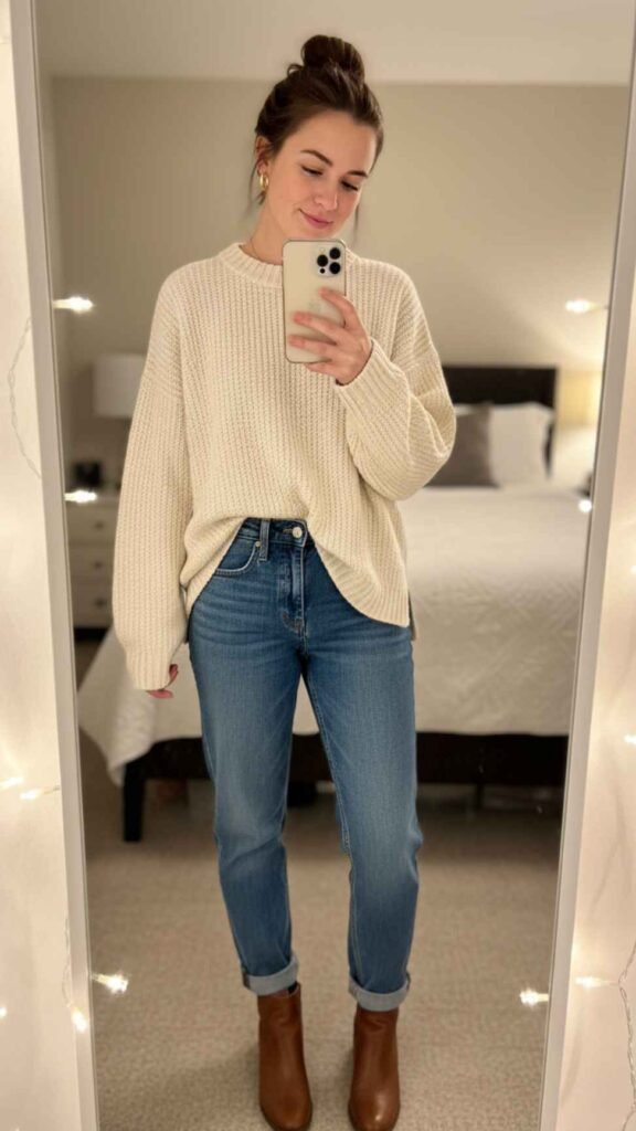 4. Cozy Knit Sweater + Boyfriend Jeans + Ankle Boots