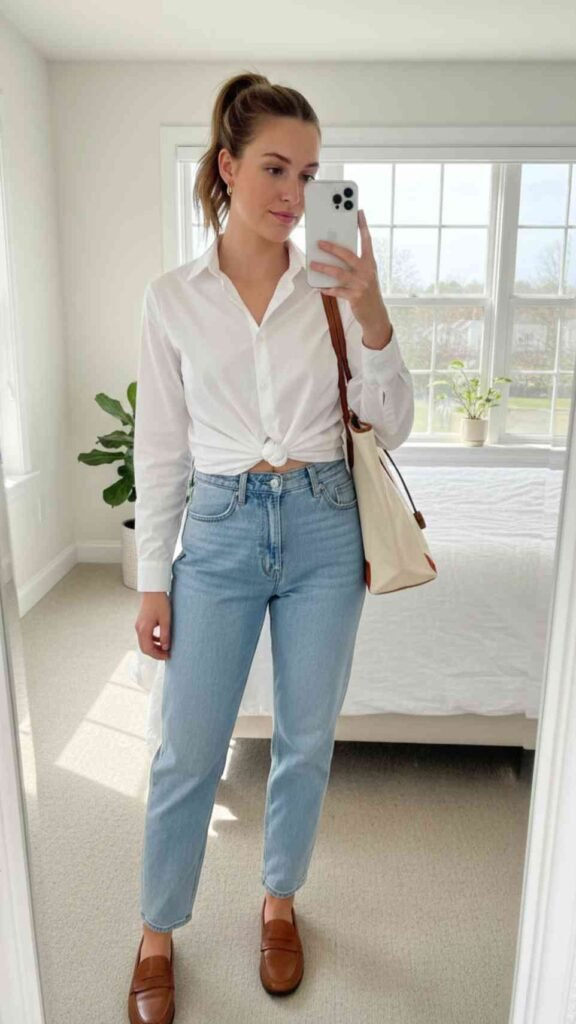 Tying a classic button down shirt at the waist over mom jeans with loafers is one of those outfits that looks like something out of a vintage magazine in the best way. It’s relaxed and a little preppy at the same time and it works so well for a casual day out. Use a white, blue stripe, or even a plaid flannel shirt depending on the season – leave it unbuttoned with a little cami underneath or button it all the way up depending on your vibe. Mom jeans sit perfectly with this silhouette and loafers keep the whole thing feeling intentional rather than sloppy.