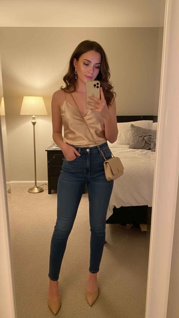 When you want to look dressed up but still wear jeans, a satin cami with high waist dark wash jeans and mules is the exact formula you need. The satin fabric instantly makes the outfit feel more elevated and evening-appropriate, and dark wash jeans are so versatile – they read almost like trousers when you style them right. Tuck the cami in, grab a small clutch or mini bag, add some drop earrings, and you have a dinner outfit that is genuinely gorgeous. This works in black, champagne, deep burgundy, or any jewel tone depending on what you’re going for.