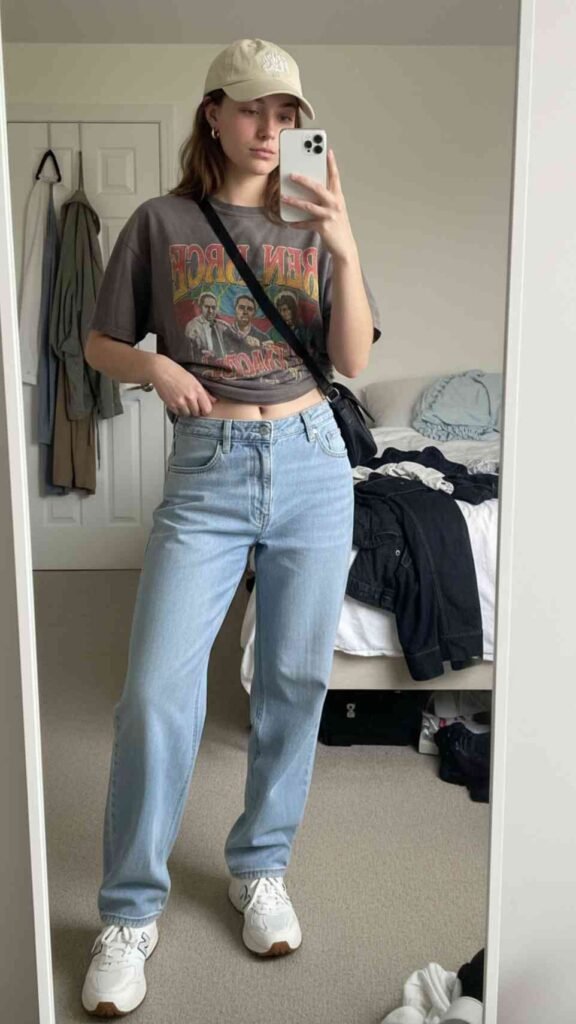 If your style is more on the cool and casual side this is the outfit that just captures that energy perfectly. An oversized graphic tee – a band tee, a vintage style print, anything you love – tucked loosely or knotted slightly at the front with baggy jeans and chunky sneakers is so effortlessly cool. The baggier the jeans the better with this one, and chunky sneakers like New Balance or Air Force 1s balance out all that volume in the best way. Throw on a baseball cap, a crossbody, and some small hoops and you look like you got dressed in five minutes but somehow look completely amazing.