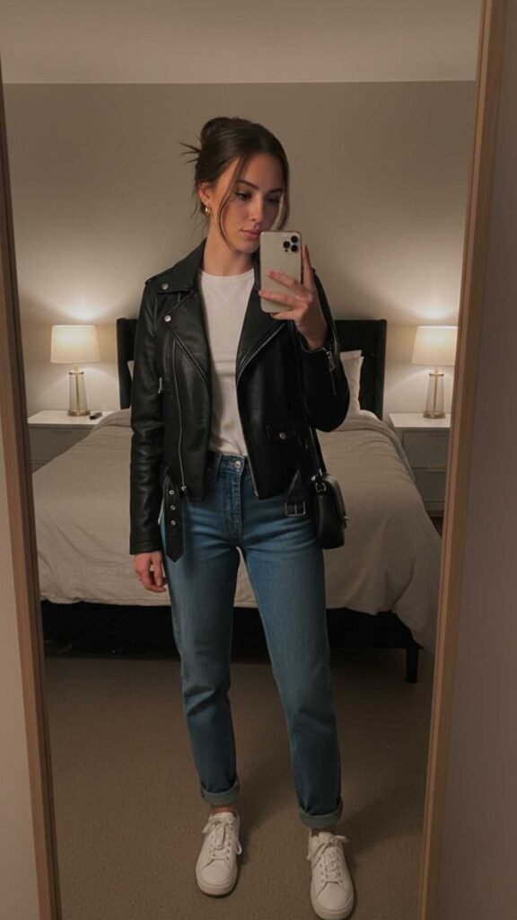 A leather jacket over a plain tee with straight jeans and white sneakers is one of those outfits that never goes out of style and always looks right. It’s the kind of thing you see on girls in New York or Paris and it just looks so easy and cool. The leather jacket is the piece that does all the work here so it’s worth investing in a good one – even faux leather looks great. Keep the tee simple and fitted, go for a straight leg jean in any wash, and white sneakers keep everything from feeling too heavy or serious. It’s a perfect everyday outfit that works year round.