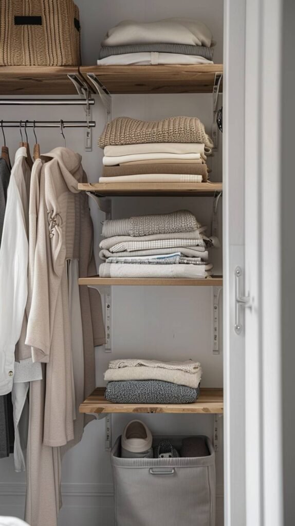 The other thing that makes such a difference is going vertical. Most small closets waste all that space above eye level and down near the floor. When you start using every inch — top shelves for seasonal stuff, floor space for bins and shoe racks — suddenly you have way more room than you thought. Add some stackable bins, a few extra hooks, and a double hang rod, and a tiny closet can hold a surprising amount without feeling like a disaster.