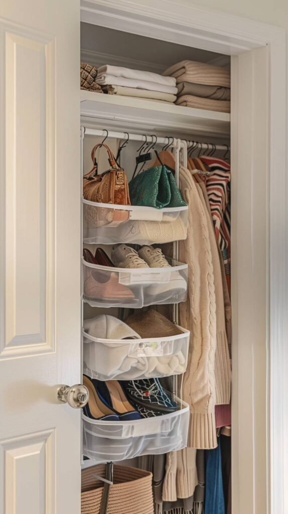 The back of your closet door is basically free storage that most people completely ignore. An over-the-door organizer can hold shoes, accessories, bags, scarves, belts — all the small stuff that usually ends up in a messy pile on the floor or shelf. There are so many options now: clear pocket organizers, hooks, small shelf units that hang over the door. You can even combine a few different types to customize exactly what you need. This works especially well for things you want visible and easy to grab, like your most-worn shoes or your everyday bags. It clears up shelf and floor space inside the closet and makes good use of a spot you were already wasting.