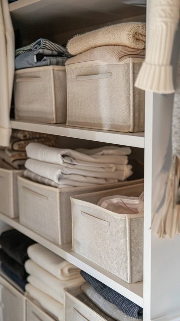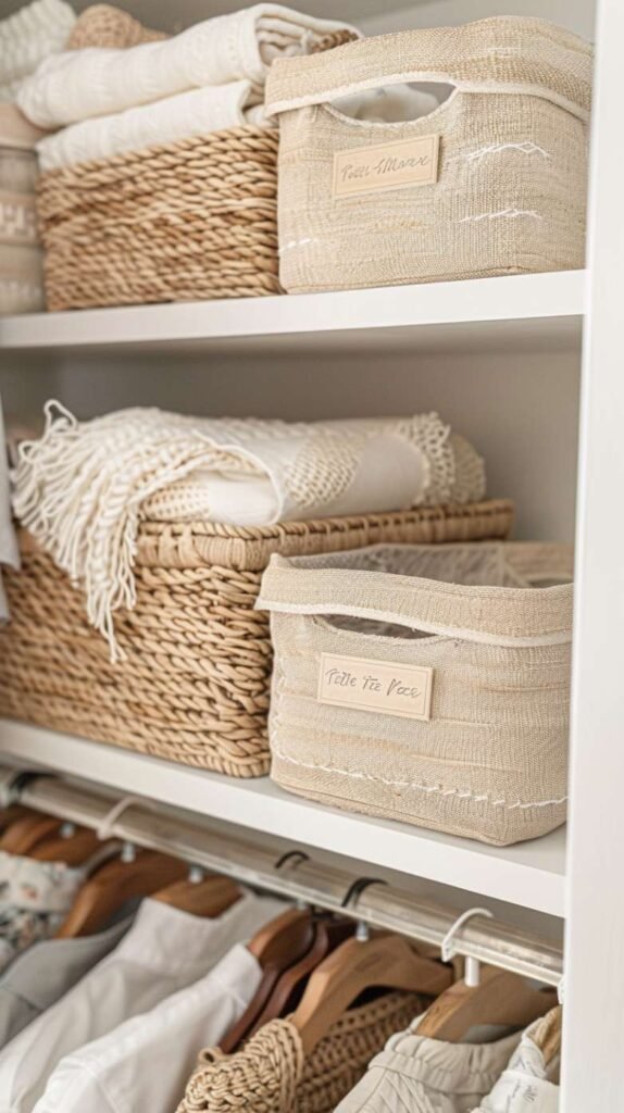 That top shelf in most small closets is where things go to disappear forever — random bags, old hats, things you tossed up there and forgot. Using labeled bins or baskets up there completely changes how usable that space is. Stack them neatly and label each one: seasonal clothes, extra bedding, handbags, workout gear. You can store a surprising amount up high when it’s in containers instead of just loose piles. Use baskets that match or coordinate so it looks intentional rather than chaotic. When everything has a labeled home, you actually put things back where they belong, and that top shelf stays organized instead of becoming a dumping ground.