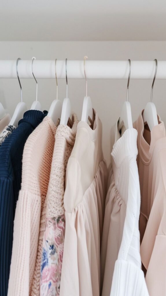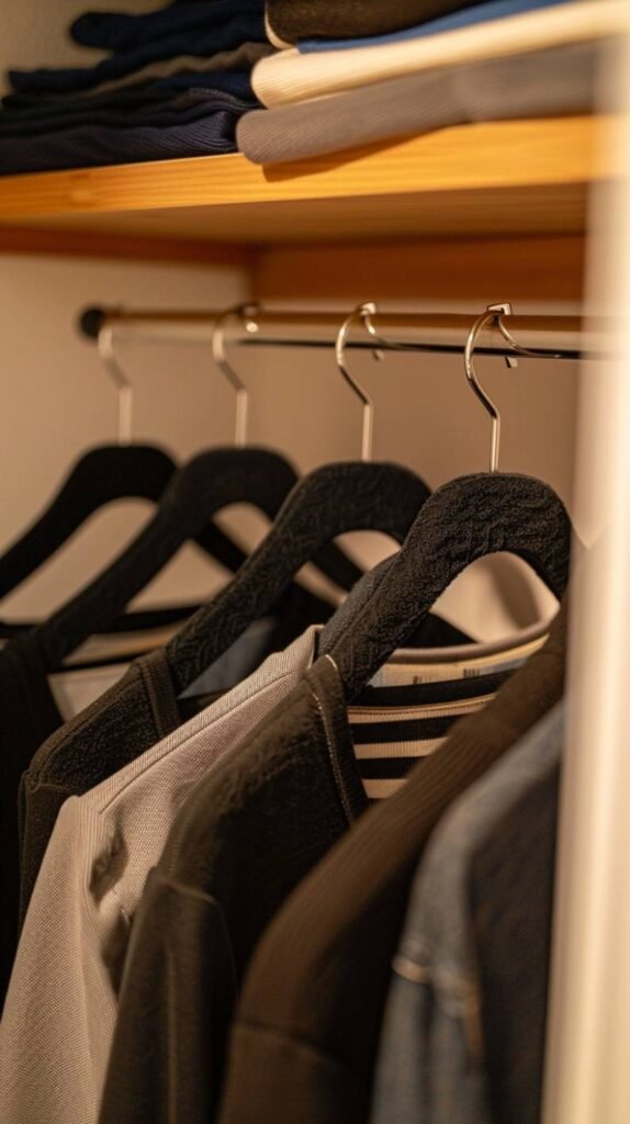 This sounds so simple but it genuinely frees up a shocking amount of rod space. Regular plastic hangers are thick and bulky — switching to slim velvet hangers can almost double the number of items you can hang in the same space. They also keep clothes from slipping off, which means things stay where you put them instead of ending up on the floor. When all your hangers match, your closet instantly looks cleaner and more put-together even if nothing else changes. It’s one of those tiny upgrades that makes your whole closet feel more organized. Do it all at once rather than gradually — the visual difference when everything is matching and slim is really satisfying.