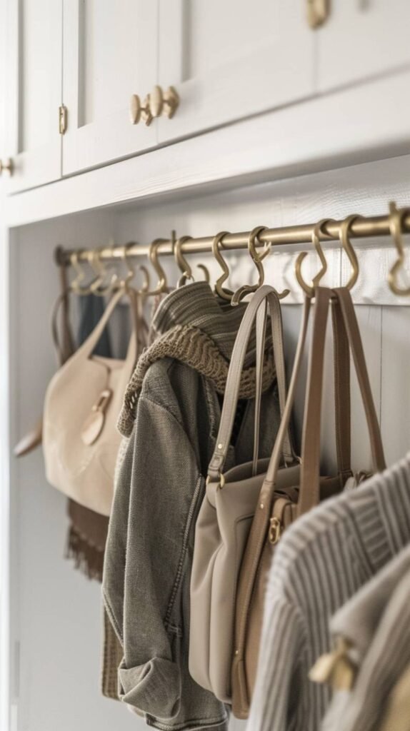 The side walls inside your closet are almost always empty, and they’re perfect for hooks. You can hang bags, belts, hats, robes, jewelry — basically anything that usually ends up draped over a chair or piled on a shelf. Command hooks are great if you don’t want to put holes in the wall, or you can install a small row of real hooks for heavier items. This is especially useful for the things you reach for every single day, like your everyday bag or your most-worn jacket. Keeping them on a hook right inside the closet means they’re visible, easy to grab, and not taking up shelf or floor space.