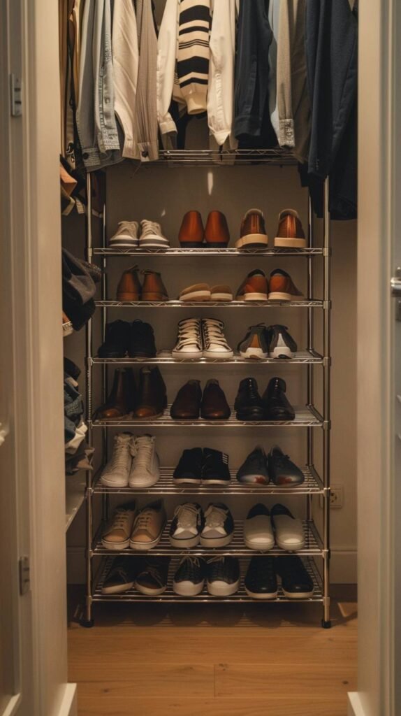 How-To Tip: Measure your closet floor space before buying a shoe rack — some narrow styles fit in just 10–12 inches of depth. Clear stackable shoe boxes are worth the investment if you have heels or shoes you want to protect.
