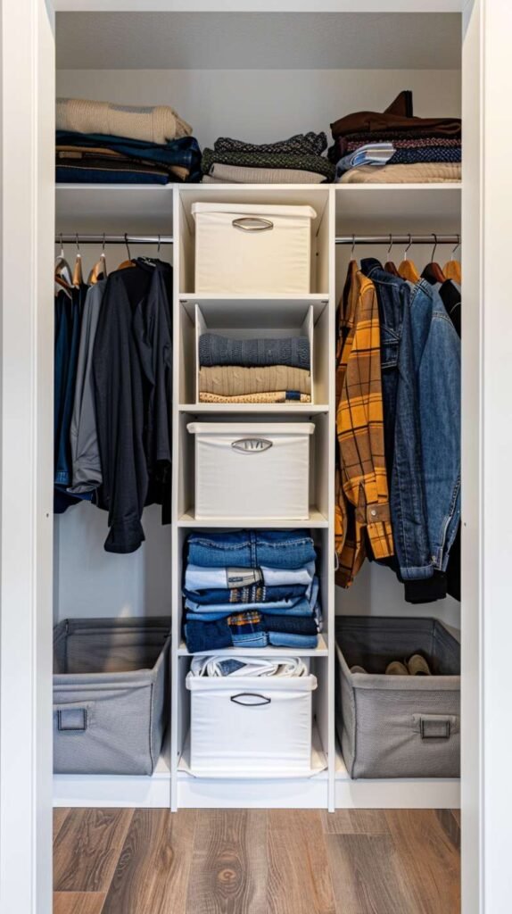 If your small closet has a shelf or a built-in drawer section, adding dividers or small bins inside makes a huge difference. Without dividers, folded clothes turn into a collapsed pile the second you pull one thing out. With dividers, each category stays in its own section — tanks in one spot, workout clothes in another, pajamas in another. You can use actual drawer dividers, small fabric bins, or even repurposed shoeboxes. The key is giving each type of clothing its own defined space so things don’t mix together. It takes maybe 20 minutes to set up and it saves you so much time and frustration every single morning.